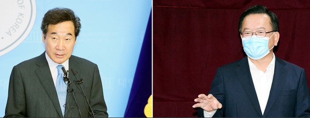 더불어민주당 당 대표에 도전하는 이낙연 의원(왼쪽)이 국회 소통관에서, 김부겸 전 의원이 광주시의회에서 7일 당 대표 출마 의사를 각각 밝히고 있다.