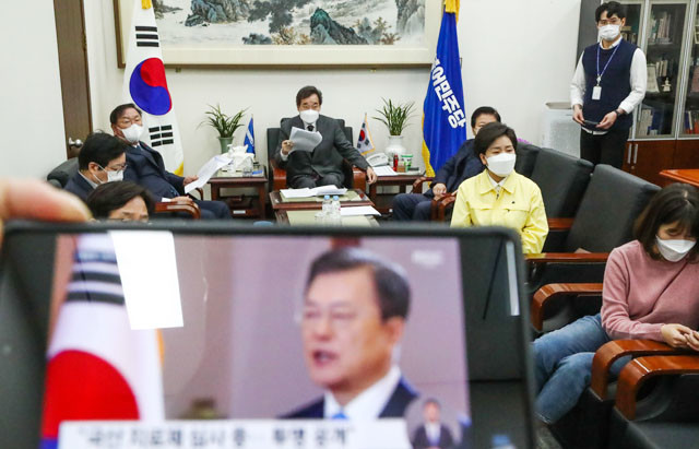 더불어민주당 이낙연 대표, 김태년 원내대표와 최고위원들이 11일 국회에서 문재인 대통령의 ‘2021년 신년사’ 방송을 시청하고 있다.