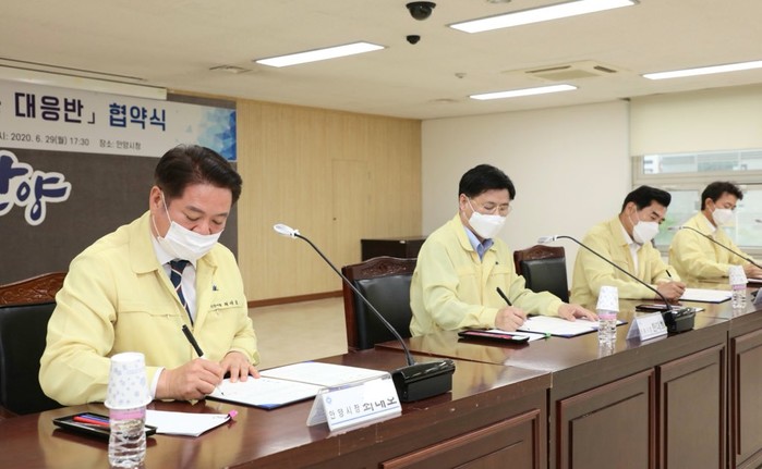 경기 안양시가 29일 시청에서 군포·의왕·과천 3개 지자체와 함께 코로나19 공동대응을 위한 협약을 체결했다. 이날 협약식에는 최대호 시장을 비롯 3개 시 단체장이 참석해 상호협력과 지원을 약속했다. 사진은 최 시장(왼쪽)과 3개 단체장이 협약서에 서명하는 모습. (사진제공=안양시청)
