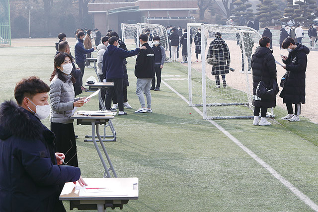 23일 오전 광주 서구 화정동 광덕고등학교 운동장에서 3학년 학생들이 대학수학능력시험 성적표를 받고 있다. 광덕고는 신종 코로나바이러스 감염증(코로나19) 확산을 예방하고자 야외에서 수능 성적표를 배부했다.