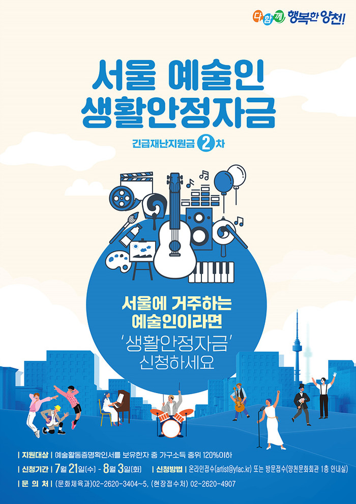 [시민일보 = 이대우 기자] 서울 양천구(구청장 김수영)가 코로나19로 경제적인 어려움을 겪는 예술인을 지원하기 위해 21일부터 오는 8월3일까지 ‘서울 예술인 생활안정자금(예술인 긴급재난지원금 2차)’의 신청을 받는다.
