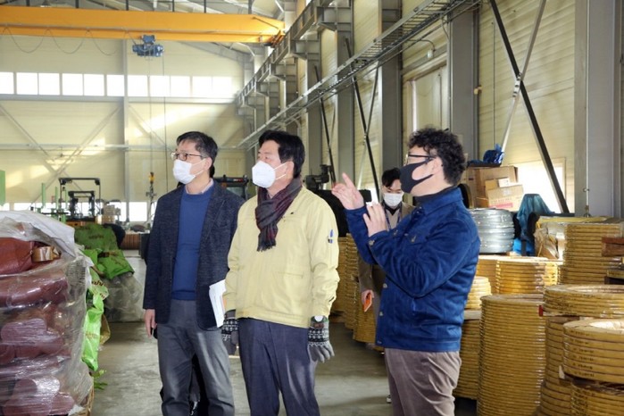 김광철 경기 연천군수가 지난 13일 코로나19 등 대내외적 어려운 경제환경에 놓인 지역소재 기업 백학산업단지 입주기업체 협의회 대표회사 GNI, 청산대전일반산업단지 조합, 청산면 소재 성원냉동식품 및 참한식품을 차례로 방문해 점검했다. 사진은 이날 김 군수가 기업 현장을 둘러보는 모습. (사진제공=연천군청)