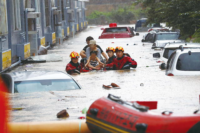 대전 지역에 역대 네번째로 많은 기록적 폭우가 쏟아져 1명이 사망하고 아파트 28가구, 주택 85가구, 차량 55대가 침수되는 피해가 발생했다. 사진은 30일 오전 대전 서구의 한 아파트 주차장과 건물 일부가 물에 잠겨 주민들이 소방대원의 도움을 받고 있는 모습.