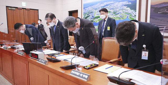 변창흠 국토교통부 장관(왼쪽 두 번째)과 장충모 한국토지주택공사(LH) 사장 직무대행(오른쪽)을 비롯한 참석자들이 9일 오후 서울 여의도 국회에서 열린 국토교통위원회 전체회의에서