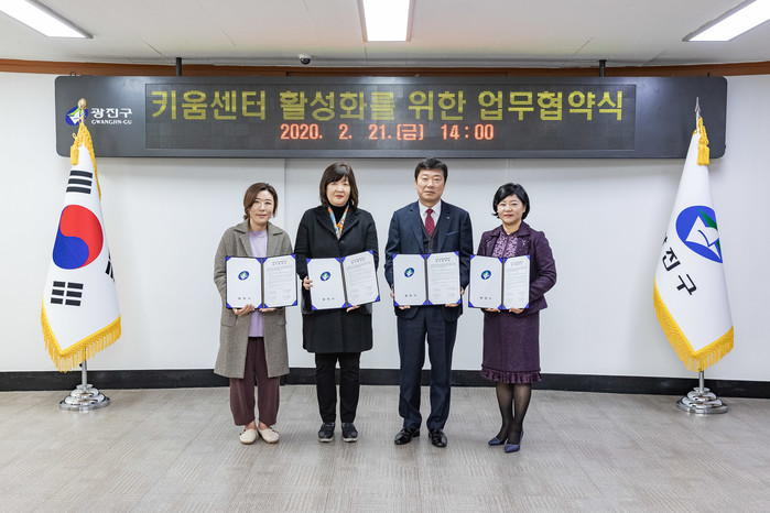 서울 광진구는 최근 지역내 국공립·민간 어린이집 연합회, 사립 유치원 연합회와 ‘우리동네 키움센터 활성화를 위한 업무협약’을 체결했다. 우리동네 키움센터는 만 6~12세의 돌봄이 필요한 모든 아이에게 쉼·여가·놀이공간을 제공함으로써 방과후 초등학생 아이들의 돌봄공백을 해소하고자 마련된 공간이다. 사진은 협약식에 참여한 관계자들이 기념촬영을 하는 모습. (사진제공=광진구청)