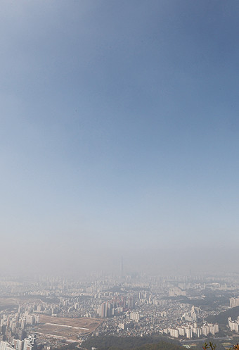 서울 등 수도권 미세먼지 농도가 ‘나쁨’ 수준을 보인 20일 경기 광주시 남한산성에서 바라본 서울 하늘에 미세먼지가 드리워져 있다. 미세먼지 농도는 수도권·세종·충북·충남은 ‘나쁨’, 그 밖의 권역은 ‘좋음’∼‘보통’ 수준으로 예상된다. 다만 전북은 오전에 ‘나쁨’, 대전·광주는 일시적으로 ‘나쁨’ 수준이겠다.