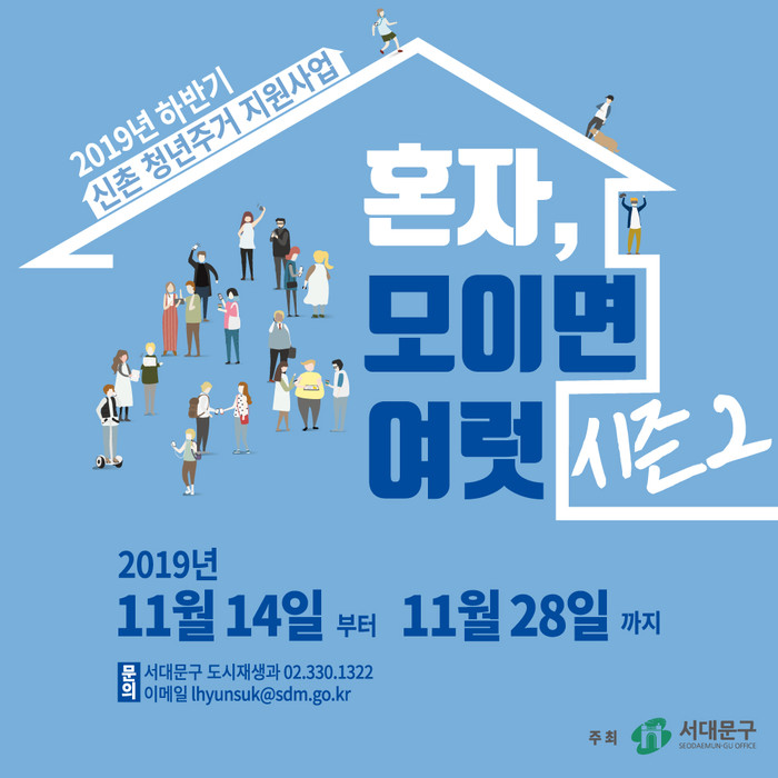 [시민일보 = 홍덕표 기자] 서울 서대문구(구청장 문석진)가 오는 14·20·28일 오후 7~9시 '신촌, 파랑고래'(연세로5나길 19) 3층 꿈이룸홀에서 청년 주거지원 프로그램 '혼자, 모이면 여럿' 시즌2를 운영한다.