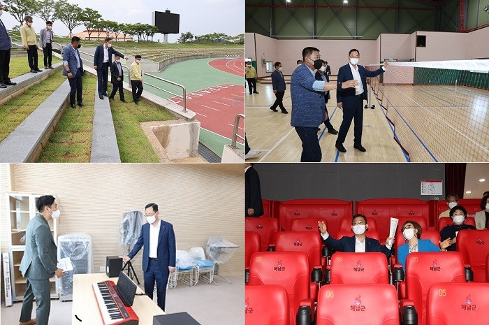 | ▲ 명현관 해남군수, 30일 체육, 문화시설 현장 점검, /상단 좌측부터 시계방향으로 우슬종합운동장 스텐드 시설 등 리모델링 사업 점검, 우슬배드민턴장, 작은영화관, 청소년문화센터, 현장 점검 / 사진=해남군 제공 |