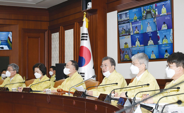 문재인 대통령이 3일 국무회의를 주재하고 있다. 오른쪽부터 박재민 국방부 차관, 최기영 과기부 장관, 문 대통령, 홍남기 경제부총리, 추미애 법무부 장관, 이재갑 고용부 장관.