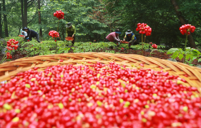 경남 함양군 휴천면 삼봉산 산양삼 채종단지에서 붉게 익은 산양삼 씨 수확이 한창이다.
