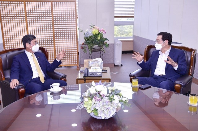 [광주=정찬남 기자] 이용섭 광주광역시장(우측)은 26일 오후 세종시 정부종합청사를 방문해 안도걸 기획재정부 제2차관을 만나 광주의료원 설립 예타 면제와 광주시 주요 현안사업에 대한 예산지원 등을 건의했다.