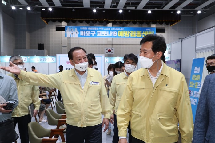 유동균 마포구청장이 15일 오세훈 서울시장과 함께 마포구민체육센터에 있는 코로나19 예방접종센터를 방문해 방역대책 상황을 점검하고, 마포구 합정경로당을 방문했다. 사진은 유 구청장(왼쪽)과 오 시장이 예방접종센터를 둘러보는 모습. (사진제공=마포구청)