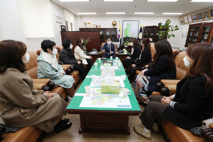 | ▲ 이용균 의장(가운데)이 국공립어린이집 연합회 임원진과 영유아 보육에 관한 상황을 논의하고 있다. (사진제공=강북구의회) |