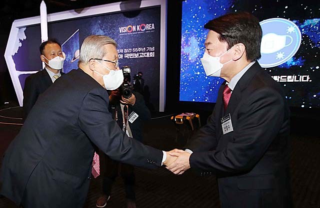 17일 오전 서울 중구 신라호텔에서 열린 매일경제 창간 55주년 제30차 국민보고대회에서 국민의힘 김종인 비상대책위원장(왼쪽)과 국민의당 안철수 서울시장 후보가 인사하고 있다.