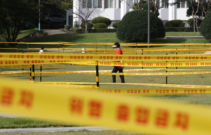 이달 4일 오후 광주 전남대학교 교정 잔디밭에 코로나19 확산 방지 목적으로 출입 통제 라인이 설치돼 있다. 전남대는 최근 많은 시민이 가족 단위 등 단체로 잔디밭을 찾아 자구책 차원에서 출입 통제 라인을 설치했다.