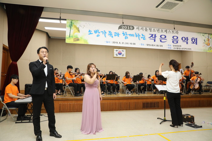 최근 서울 양천소방서가 양천구 서서울청소년오케스트라를 초빙해 ‘소방가족과 함께하는 작음 음악회’를 성황리에 마쳤다. 사진은 참여자들이 공연을 선보이는 모습.(사진제공=양천소방서)