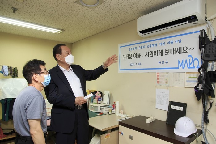 [시민일보 = 홍덕표 기자] 서울 마포구(구청장 유동균)는 지난 28일 마포트라팰리스2차아파트 지하 4층에 마련된 공동주택 근로자 휴게실에 최신식 에어컨을 지원했다고 밝혔다.