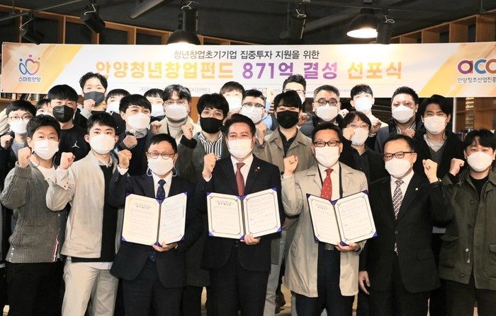 경기 안양시는 지난 10일 청년창업투자 생태계를 조성해 스타트업과 중소·벤처기업의 혁신성장을 지원하는 안양시청년창업펀드 결성 선포식을 열고, 펀드운용사인 (주)LSK인베스트먼트·(주)티인베스트먼트와 업무협약을 맺었다. 사진은 협약식에서 최대호 시장(앞줄 가운데)과 관계자들이 기념촬영을 하는 모습. (사진제공=안양시청)