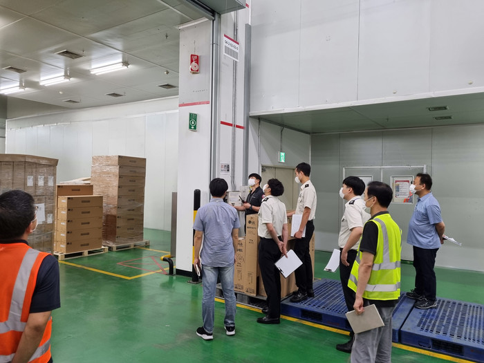 경북 구미시는 최근 물류창고의 안전사고 예방을 위해 구미소방서와 합동으로 지역내 물류시설업체 8곳(택배터미널 3, 물류창고 5)에 대한 특별점검을 실시했다. 이번 특별점검은 최근 대형물류창고의 화재로 인한 인명피해와 재산피해가 지속적으로 발생함에 따라 추가 피해를 예방하기 위해 진행됐다. 사진은 관계자들이 물류시설업체의 소화전 상태를 점검하고 있는 모습. (사진제공=구미시청)