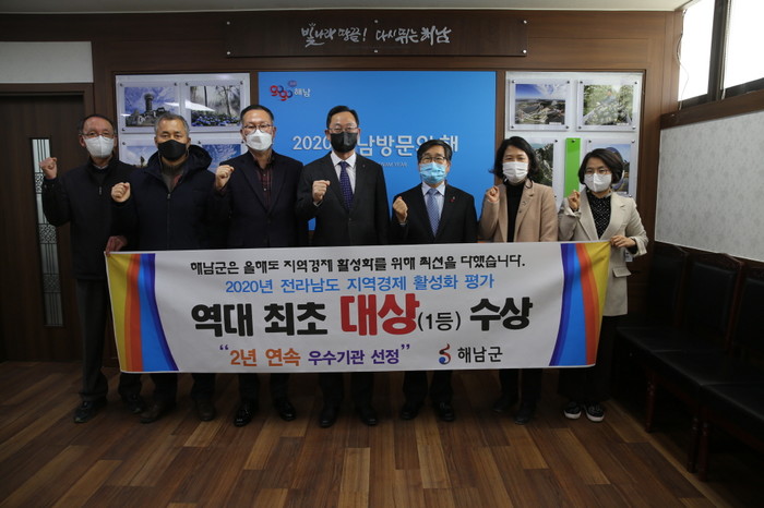 지역경제활성화 평가 대상 수상시 명현관 해남군수(가운데) 군 관계자들의 기념 촬영 모습.
