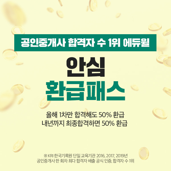 [시민일보 = 황혜빈 기자] 종합교육기업 에듀윌이 공인중개사 시험에 합격하면 수강료를 돌려주는 ‘안심환급패스’를 마련하고 할인혜택을 제공한다고 28일 밝혔다.