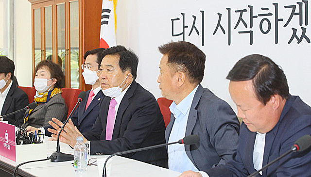 미래통합당 심재철 당 대표 권한대행이 22일 국회에서 열린 최고위원회의에서 ‘당 지도체제’ 전수조사 결과 ‘비대위 체제’로 전환한다고 밝히고 있다.