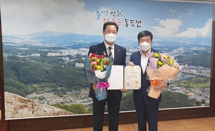 임상우 동두천시청소년유해환경감시단장이 27일 청소년 육성 및 보호 유공 국무총리 표창을 받았다. 임 단장은 2005년부터 청소년유해환경감시단 활동 등을 통해 청소년의 건전한 성장환경 조성에 기여한 공로를 인정받았다. 사진은 최용덕 시장(오른쪽)과 임 단장이 기념촬영을 하는 모습. (사진제공=동두천시청)