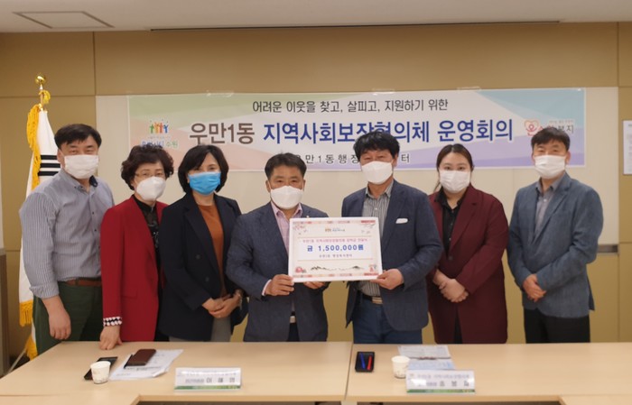 경기 수원시 팔달구 우만1동 지역사회보장협의체는 지난 15일 위원들이 발굴한 저소득층 가정의 중학생 3명에게 50만원씩 총 150만원의 장학금을 전달했다. 사진은 관계자들이 기념촬영을 하는 모습. (사진제공=팔달구청)