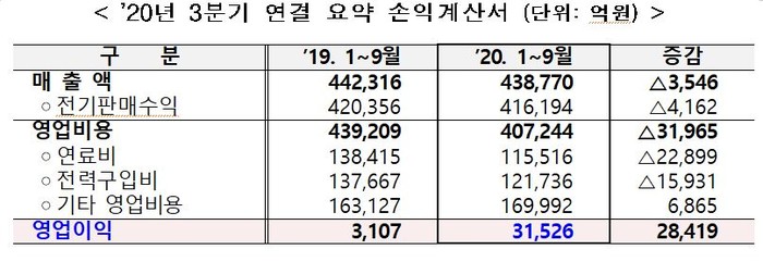 2019년 하반기 이후 국제 연료가격 하락과 수요감소 등으로 연료비 및 전력구입비는 3조9000억원 감소했다.