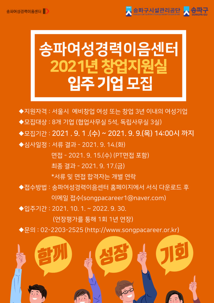 [시민일보 = 이대우 기자] 서울 송파구시설관리공단 여성경력이음센터는 여성의 스타트업 지원을 위한 창업 사무공간에 입주할 새로운 입주자를 모집한다고 밝혔다.