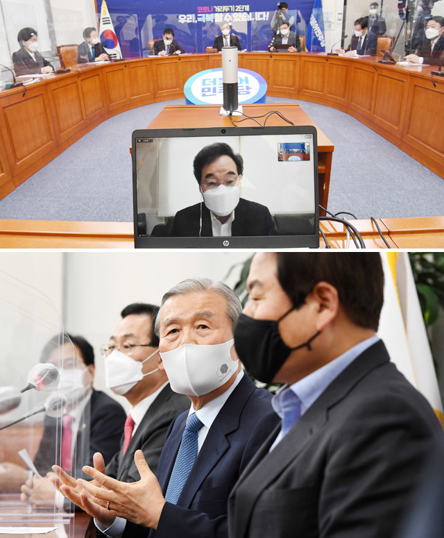 더불어민주당 이낙연 대표가 25일 서울 여의도 국회에서 열린 최고위원회의에 화상으로 참석, 윤석열 검찰총장 관련 발언을 하고 있다(위). 국민의힘 김종인 비상대책위원장이 25일 국회에서 열린 긴급 기자회견에서 윤석열 검찰총장에 대한 징계 청구와 직무배제에 대한 입장을 밝히고 있다.