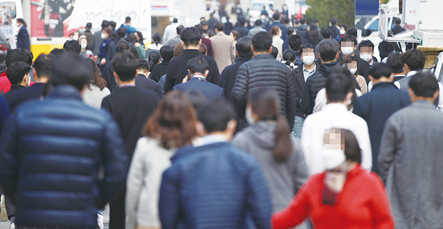서울시가 19일 0시부터 사회적 거리두기 1.5단계에 해당하는 방역 조치를 시행하겠다고 밝힌 17일 서울 여의도 인근 식당가에서 직장인 등이 점심을 위해 이동하고 있다.