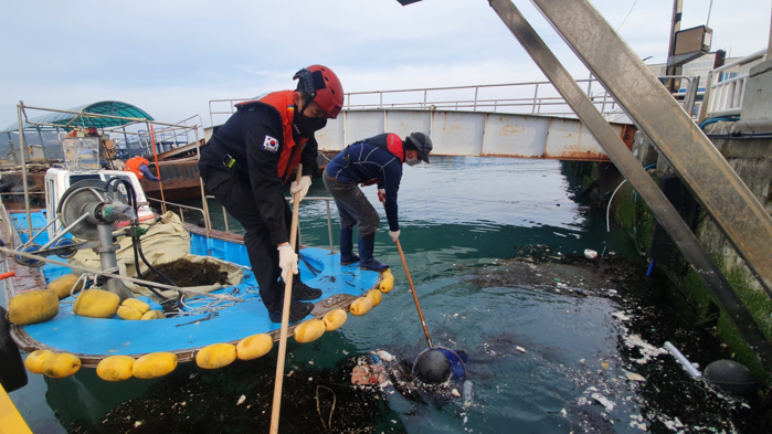 목포해경에 따르면 지난 11일 관내 흑산파출소와 흑산도 주민 등 20여명이 참여한 가운데 연안구조정과 민간 선박 2척, 포크레인을 동원하여 흑산도 진리선착장 해안가 및 여객선 터미널 주변, 예리항 인근 해상에서 폐기물 수거용 용기 5마대 분량 총 2톤의 괭생이 모자반 등 해양 쓰레기를 수거했다.