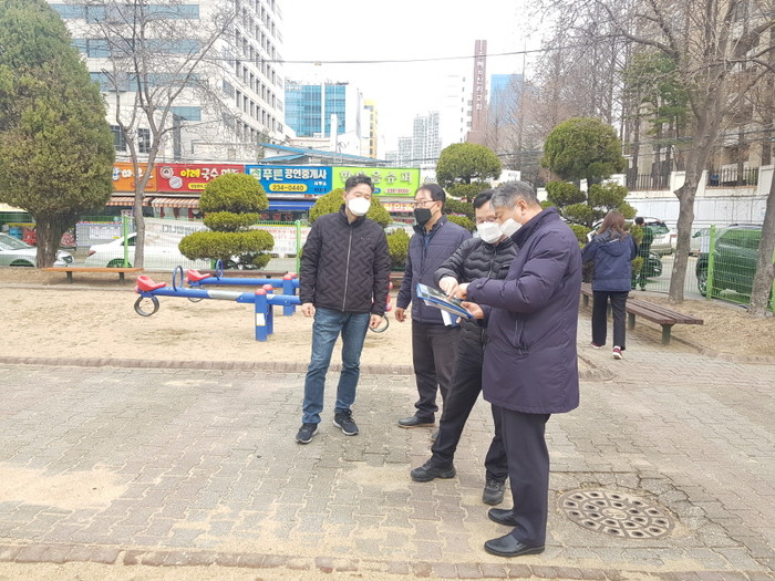 경기 수원시 팔달구 백운오 구청장은 지난 3~4일 율현초 주변 녹지대, 화서 카페거리 완충녹지, 미소어린이공원 등 지역내 녹지조성 대상지 현장을 방문해 사업계획을 검토하고 구민들의 의견을 청취했다. 사진은 백 구청장(오른쪽에서 두 번째)이 관계자들과 이야기를 하는 모습. (사진제공=팔달구청)