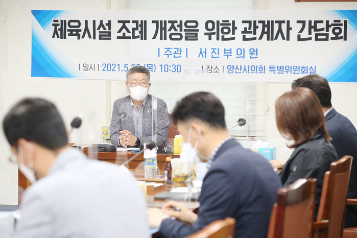 양산시의회 서진부 의원(서창동, 소주동)은 20일 오전 시의회 특별위원회실에서 “양산시 체육시설 조례 개정을 위한 관계자 간담회”를 개최했다.