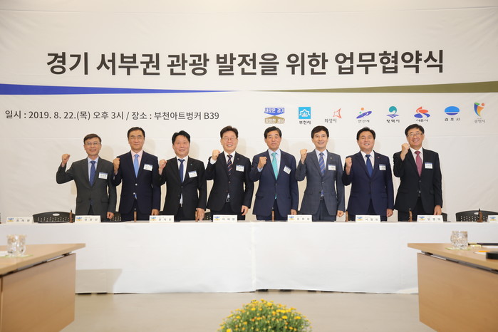 경기 평택시가 최근 부천 아트벙커에서 경기서부권문화관광협의회와 경기 서부권 관광발전을 위한 협약을 체결했다. 사진은 협약식에 참석한 이재명 도지사(왼쪽에서 네 번째)와 정장선 시장(왼쪽에서 두 번째) 등 7개시 단체장들이 협약 후 기념촬영하는 모습. (사진제공=평택시청)