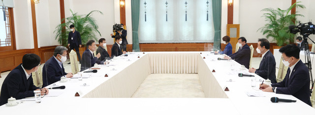 문재인 대통령과 더불어민주당 지도부가 ‘원팀’ 정신을 되새기며 코로나19 확산에 따른 민생 위기를 해결하겠다는 의지를 다졌다. 문 대통령은 9일 이낙연 대표 등 민주당 지도부를 청와대로 초청해 간담회를 하고 국정운영 협력 방안 등을 논의했다. 문 대통령은 이 자리에서 “지금 당정 간 여러 관계는 환상적이라고 할 만큼 좋은 관계”라고 말했다. 이에 이 대표는 “당정청은 운명 공동체고, 당은 그 축의 하나”라면서 “책임을 다하도록 하겠다”고 화답했다.