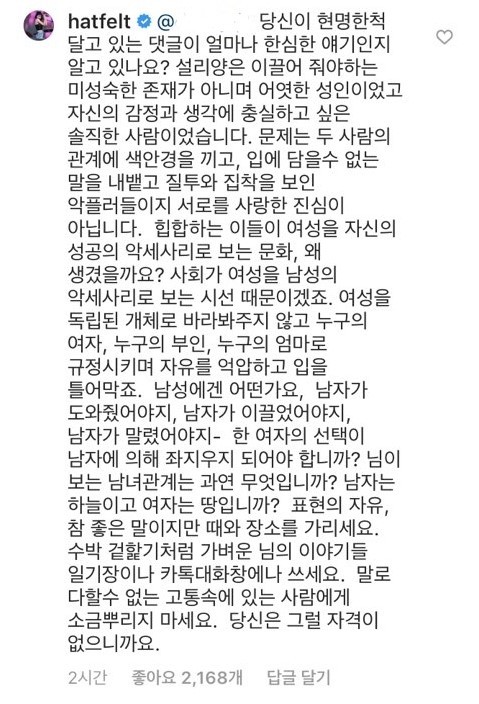 이에 핫펠트는 16일 "당신이 현명한 척 달고 있는 댓글이 얼마나 한심한 얘기인지 알고 있나. 설리 양은 이끌어 줘야하는 미성숙한 존재가 아니며 어엿한 성인이었고 자신의 감정과 생각에 충실하고 싶은 솔직한 사람이었다"라고 답글을 달며 반박했다.