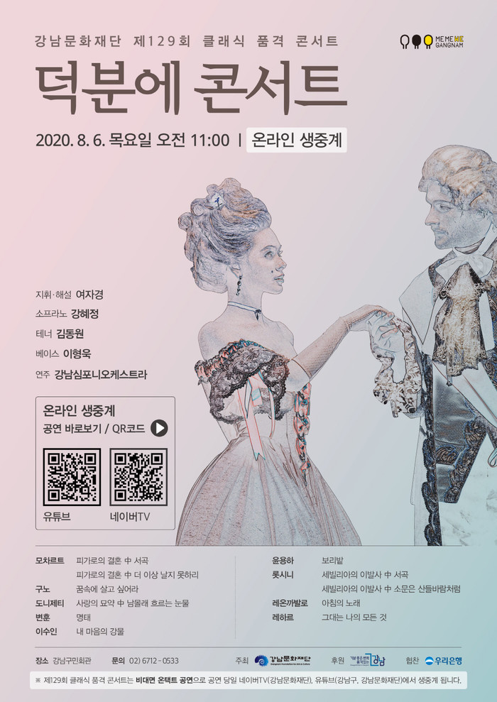 이번 ‘덕분에 콘서트’ 온라인 생중계 영상은 6일 목요일 오전 11시에 강남문화재단 홈페이지와 네이버TV, 유튜브를 통해 무료로 시청할 수 있다.