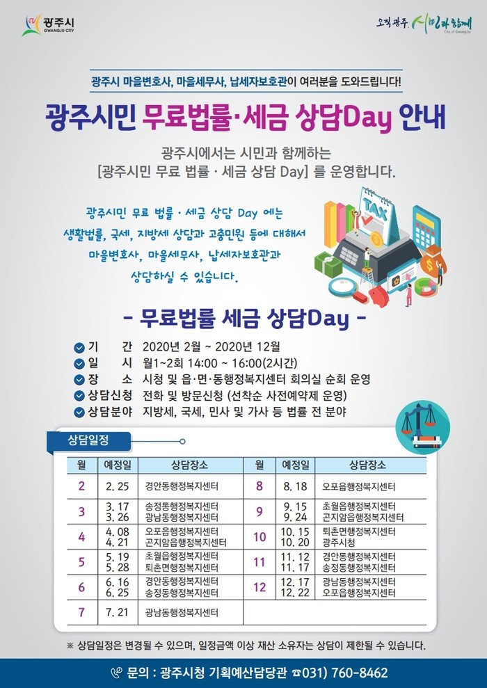 광주시민 무료 법률·세금 상담 Day는 매월 1~2회 마을변호사, 마을세무사, 납세자보호관이 함께 생활법률·세금(국세 및 지방세) 상담전반 및 필요한 법적 절차의 궁금증을 원스톱으로 해결할 수 있게 된다.