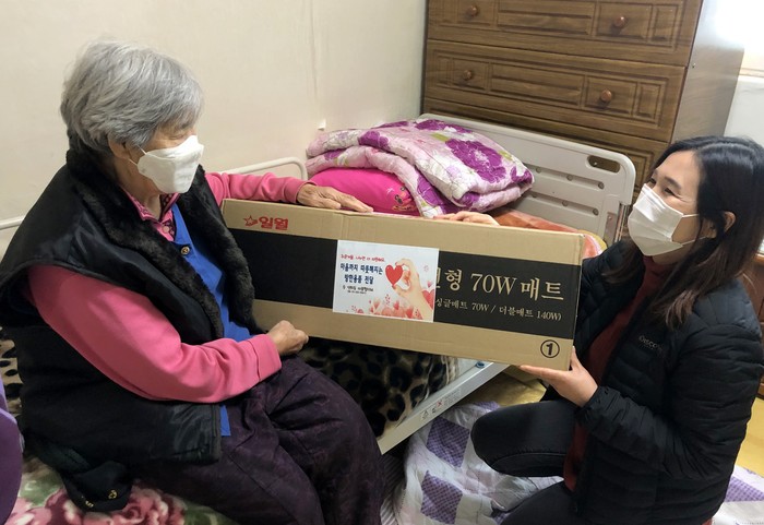 서울 서대문구 연희동 마봄협의체가 최근 주거취약계층 76가구를 대상으로 겨울내의와 초절전 전기매트 등을 지원하는 ‘마음까지 따뜻해지는 방한용품 전달’ 사업을 펼쳤다. 사진은 노인가구를 방문해 전기매트를 전달하고 있는 모습. (사진제공=서대문구청)