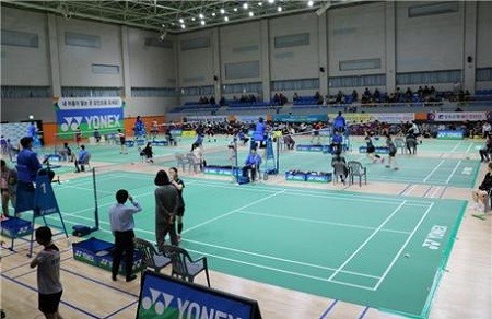 | ▲ 배드민턴 선수들,전남 강진군 제2실내체육관에서 시합중에 있다.