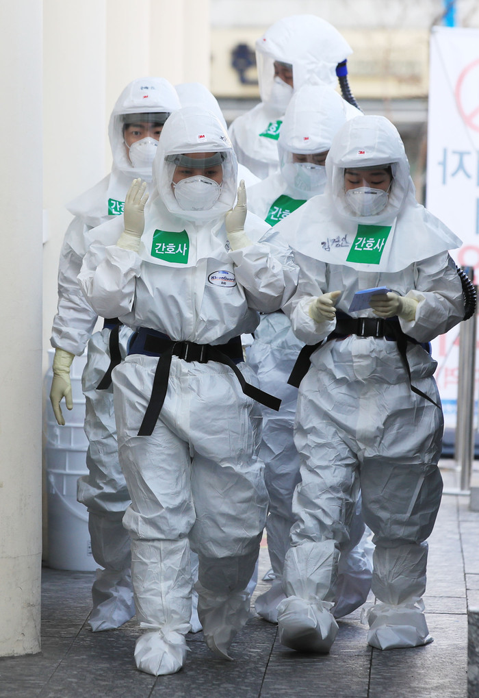 23일 오전 대구시 중구 계명대학교 대구동산병원에서 방호복을 입은 의료진이 병동으로 향하고 있다.