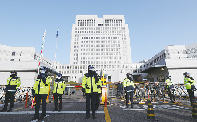 박근혜 전 대통령의 재상고심 선고 공판이 열리는 14일 오전 서울 서초구 대법원 앞에서 경찰이 만약의 사태에 대비해 출입을 통제하고 있다.