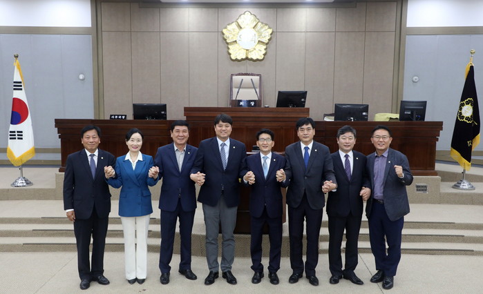 | ▲ (왼쪽부터) 이현구 도시환경위원장, 이미경 복지안전위원장, 유재광 의회운영위원장, 조석환 의장, 김기정 부의장, 양진하 기획경제위원장, 김정렬 문화체육교육위원장, 채명기 예산결산특별위원장이 기념촬영을 하고 있다. (사진제공=수원시의회) |