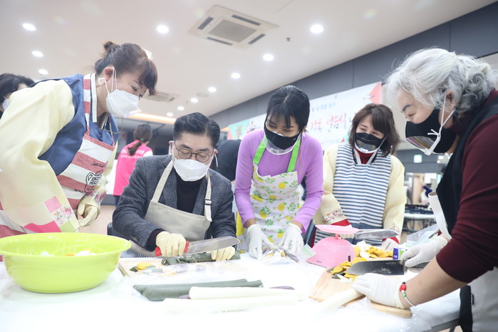 서울 강동구가 최근 설을 맞이해 취약계층 1인 가구 및 다문화가정 300명에게 모둠전·떡국떡 등 명절음식과 마스크로 구성된 ‘희망꾸러미’를 지원했다. 사진은 이날 이정훈 구청장(왼쪽에서 두 번째)이 희망꾸러미에 포장할 음식을 준비하고 있는 모습. (사진제공=강동구청)