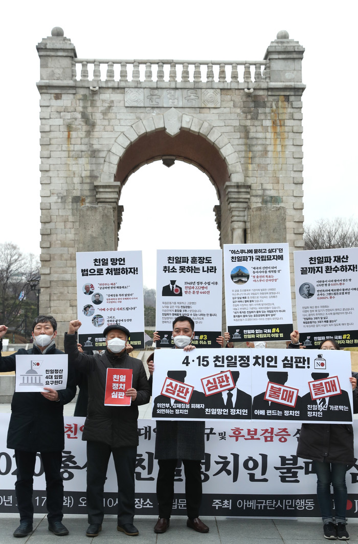 17일 오전 서울 서대문구 독립문 앞에서 아베 규탄 시민행동 회원들이 2020 총선 '친일정치인 불매, 심판!' 퍼포먼스를 하고 있다.