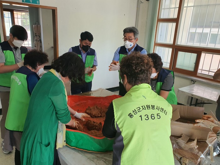 충남 홍성군 구항면 행정복지센터가 최근 오봉천의 수질 개선을 위해 악취 및 독성 제거와 수질정화 등에 탁월한 EM흙공 300여개를 투척했다. 사진은 최근 봉사자들이 인체에 무해한 수십여종의 미생물과 질 좋은 황토로 EM흙공을 만들고 있는 모습. (사진제공=홍성군청)
