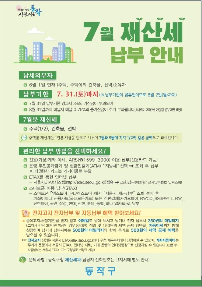 [시민일보 = 여영준 기자] 동작구(구청장 이창우)는 오는 16일~8월2일 '7월 정기분 재산세' 납부기간이라고 13일 밝혔다.