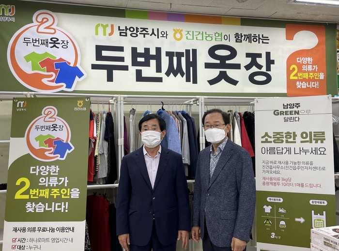 경기 남양주시 진건농업협동조합은 지난 13일 진건농협 하나로마트 용정지점에 중고 의류 나눔공간인 ‘두 번째 옷장’ 진건2호점을 개장했다. 두 번째 옷장은 누구나 나눔공간을 둘러볼 수 있고 보관된 의류품을 무료로 가져갈 수 있다. 사진은 개장식에서 관계자들이 기념촬영을 하는 모습. (사진제공=남양주시청)